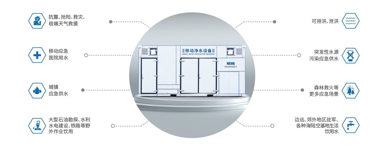 當自然災害及突發性水源污染事故發生時,需要一種能夠應付不同水源的移動應急凈水設備,滿足救援人員、受災群眾和居民基本的用水需求。當前,應急救援對基本飲用水的保障措施通常為傳統工藝組裝的凈水車、瓶裝水運輸等方式,受技術限制、天氣路況等因素影響,不能安全、及時、連續的滿足飲用水供應需求。因此,提供可移動式應急所需、戰事所需、生活所需的移動凈水設備受到離度重視。